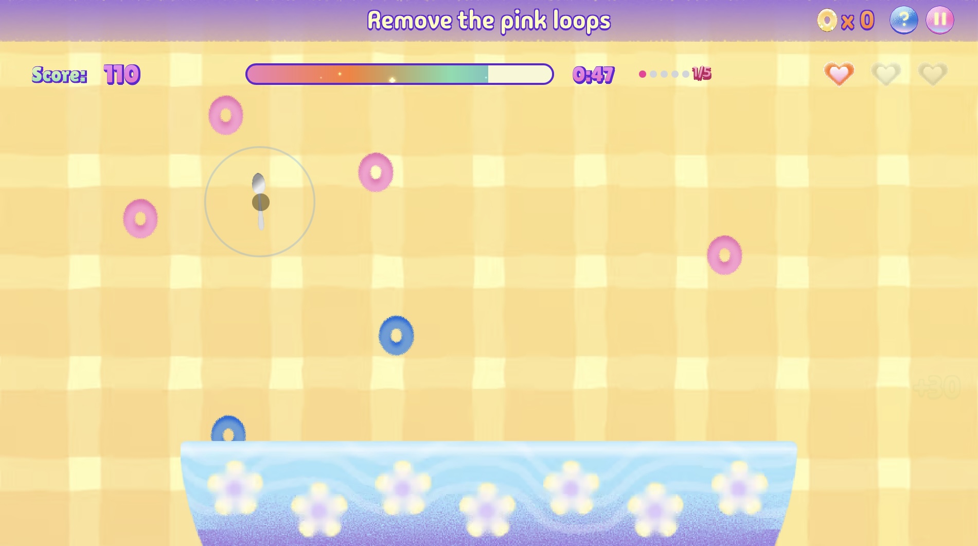 - If pink loops fall into the bowl: you lose points and 1 life 😵